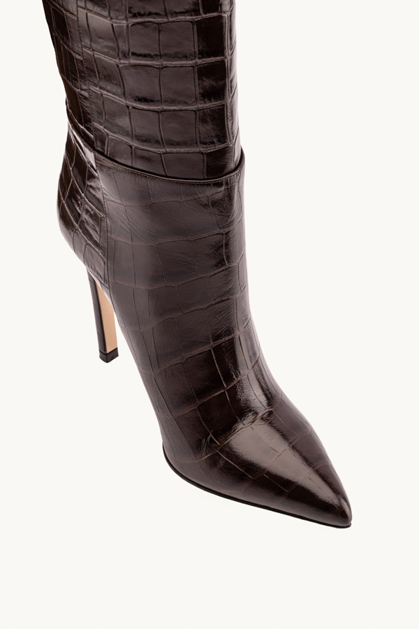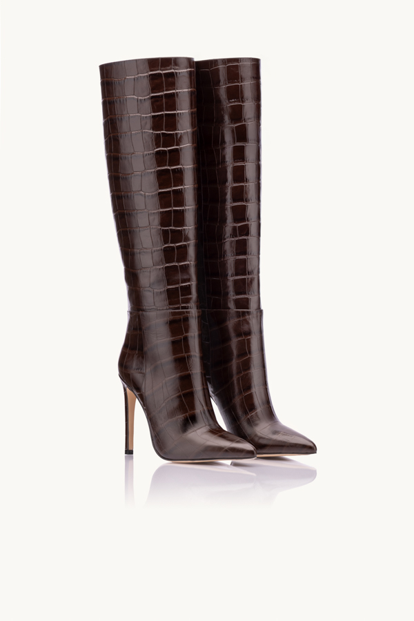 Elegantne duboke kožne čizme sa špicastim vrhom i tankom štiklom.